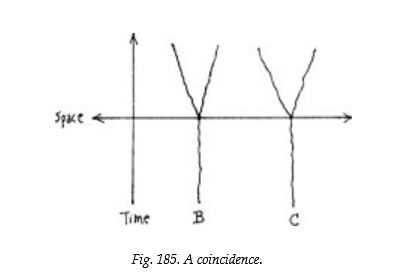 In concert with quantum mechanics, and no matter the separation distance, when two particles approach each other, they each become instantaneously and reciprocally bound by the other’s influence. Now, Einstein’s theory of relativity contends that no signal, nor anything else for that matter, could defeat the speed of light in a race. That axiom diverges, however, from what one might expect of a “coincidence,” such as the one below, in Figure 1.